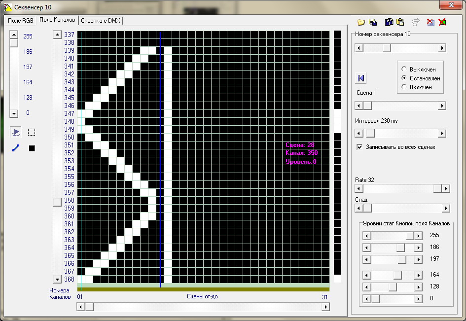 Многоканальная композиция записывается, как на студийном магнитофоне, где каждому каналу DMX соответствует